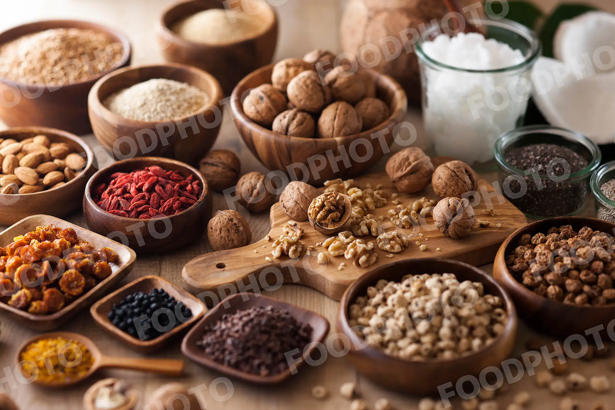 健康や美容に効果がある栄養素を豊富に含むスーパーフード。タイガーナッツ・カカオニブ・マキベリー・ポーレン・ゴールデンベリー・ゴジベリー・アーモンド・亜麻種子・キヌア・アマランサス・クルミ・ココナッツオイル・チアシードレシピありません